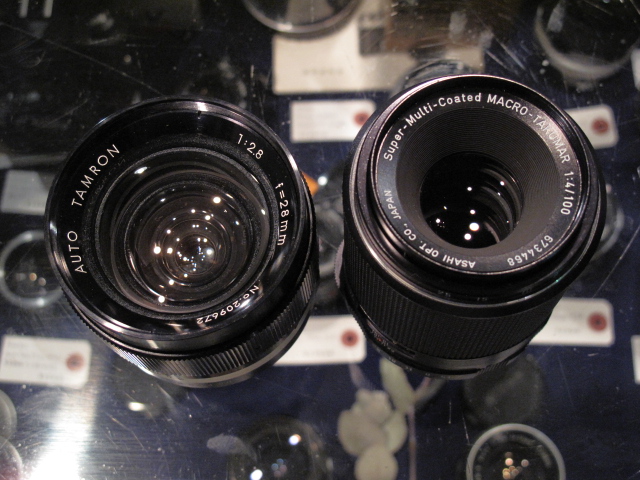 こちら2本はM42マウント、妙にでかくて重い初期のタムロン28mm f2.8、マクロタクマー100mm F4