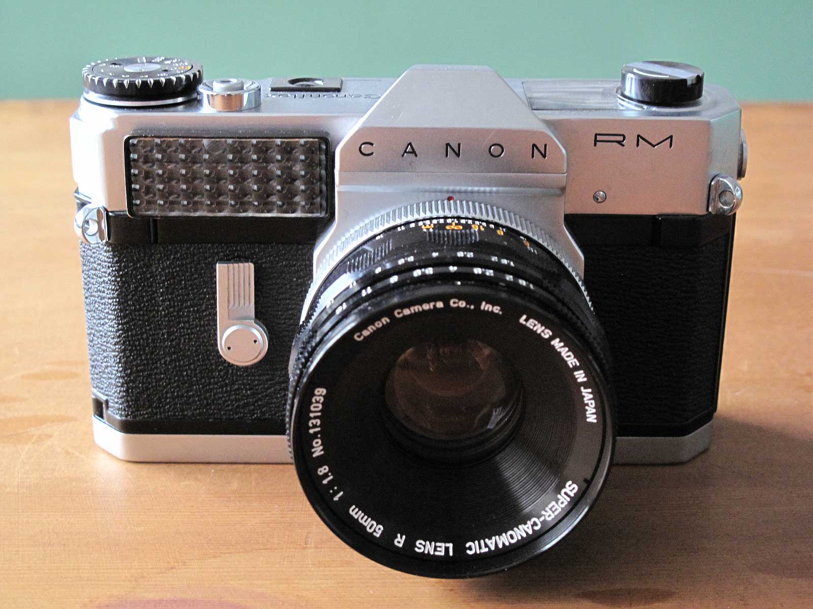 キャノンの初期の一眼レフ、キャノンフレックスRM、ペンタ部分が沈んでいるというか肩が張り出している独特な外観です。