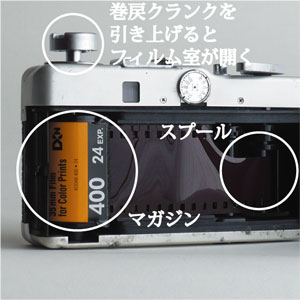 マガジンを入れフィルムの先をスプールの溝に差込み、巻上げ→シャッターを切るという動作を2回ほどして、引っ掛かりを確認します。 |