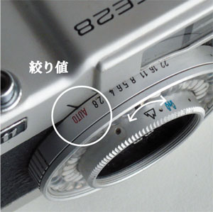 絞りは通常AUTOに設定して撮影します。それ以外の数値はストロボ撮影用。レンズ中心部はピントリングになっており、ピクトグラムを基準に目測式で距離を設定します。 |