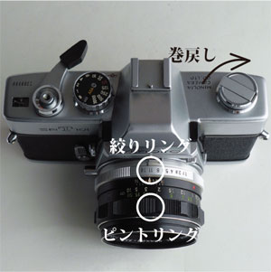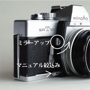 丸印のつまみを矢印方向に回すとミラーアップし、下部のスイッチを(巻上げ後に)押し込むとマニュアル絞込みで被写界深度(ピントが合う部分の幅)の確認が出来ます。