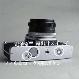 露出計のスイッチ、電池室、フィルムロック解除ボタン(フィルムを使い切った際の巻取り時に利用)はボディの底部に収まっています。