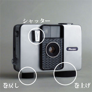 スプリングモーターのゼンマイによる自動巻上げ機構のついたハーフサイズカメラです。あらかじめ、たくさん巻上げておくことで連続シャッターが可能です。 |