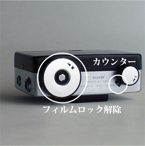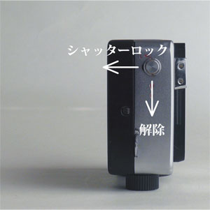 側面のボタンを下にずらすとフィルム室が開きます。横にずらすとシャッターロックになります。 |