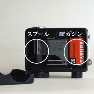 マガジンを入れフィルムの先をスプールに差し込みます。引っ掛かりを確認するため、巻き上げる→シャッターを切るという動作を2回程してみます。 |