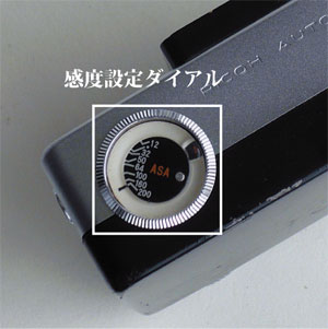 フィルムの感度(ASA)を設定します。窓の数字は絞り値ですので、通常はAで使用すれば問題ありません。 |