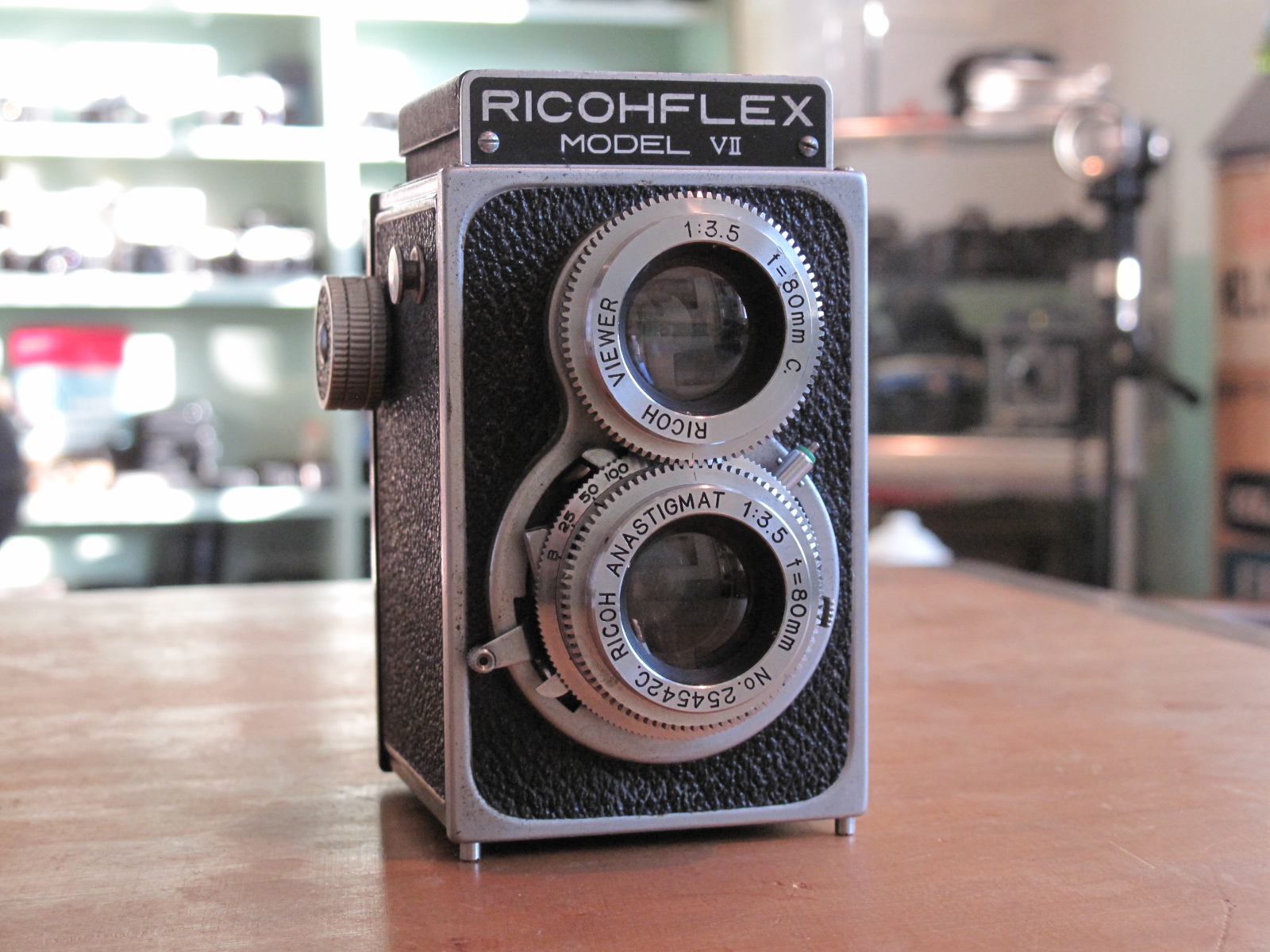 リコーフレックスはシンプルな2眼レフです。ファインダーも磨りガラス一枚、フィルム巻き上げも赤窓をみながらの手動、シャッターも2枚のレンズシャッターでバルブから1/100までの4速、最小限なぶんボディも普通の2眼レフより小さめで軽いです。またメカも少ないぶん故障も少ない良さがあります。さっぱりしていて心許なく感じるかもしれませんが使ってみると肝心な部分は押さえられていてなかなか使える一台です。sold